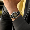 A Multifort TV Big Date karakteres, mégis letisztult megjelenésével azonnal magára vonja a figyelmet. A 40 milliméteres rozsdamentes acéltok egyszerre sportos és elegáns, valamint szembetűnő, amint a polírozott és szatinált felületek kontrasztja különleges fényjátékot eredményez. A modell színvilága a középről kifelé sötétedő, szürkéből feketébe átmenő számlappal és élénk sárga részletekkel igazán modern és feltűnő. A fekete textil szíj, amelyet sárga varrás egészít ki, tökéletesen illeszkedik a tokhoz és kiemeli az óra dinamikus karakterét.