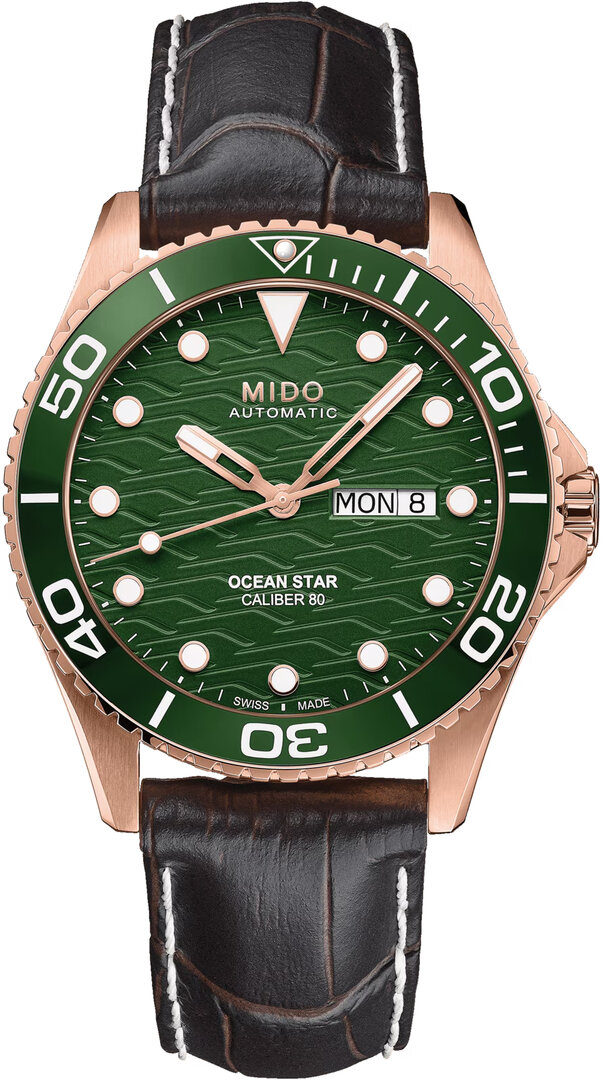 Luxus óra Mido Ocean Star 200C, Calibre 80, vízállóság 200 m, 42,50 mm. Az óra lumineszcens funkcióval, dátumkijelzővel és Day-Date funkcióval rendelkezik. Az óra alapvető paraméterei: a szerkezet típusa mechanikus óra automatikus felhúzással, vízállóság 200 m, a számlap színe zöld, a szíj anyaga bőr.