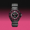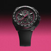 A 38 milliméteres átmérőjű tok a legtöbb csuklón jól mutat. A tok anyaga homokfúvott nemesacél, amelyet egy különleges, bio-poliamidból készült lünetta egészít ki. Ez az anyagválasztás nem véletlen: a bio-poliamid előállításához megújuló erőforrásokat használnak, így az óra a környezettudatosság szempontjából is kiemelkedik a mezőnyből. A fekete és az élénk pink színkombinációja a versenysportok dinamikáját idézi, a számlap leolvashatóságát pedig a Super-LumiNova bevonattal ellátott indexek és mutatók garantálják.