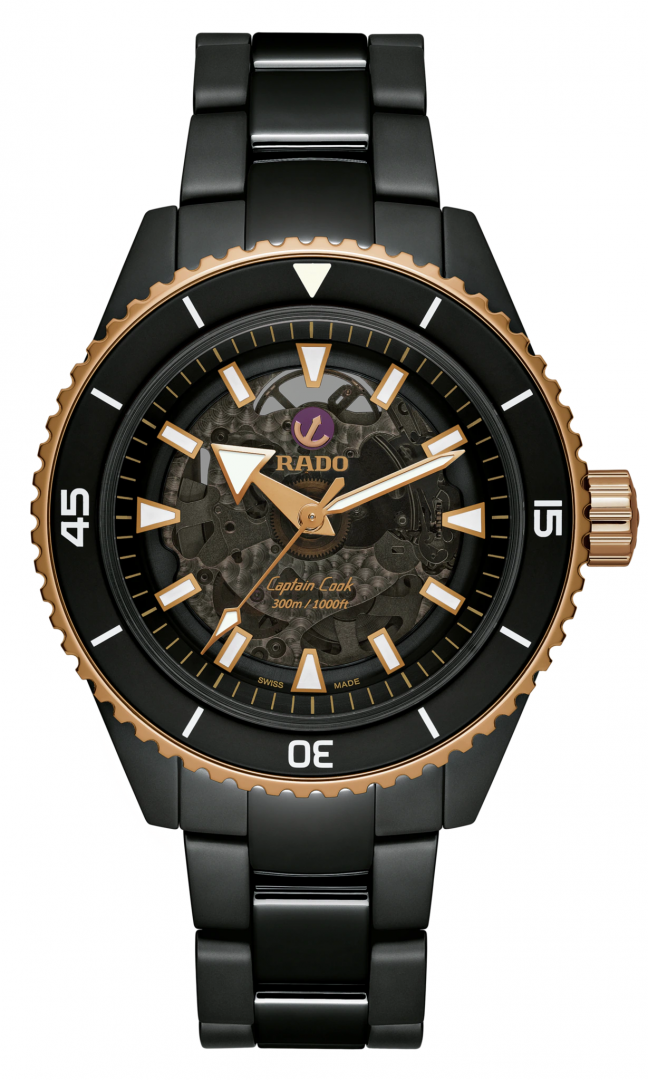 A Captain Cook High-Tech Ceramic Diver óra 300 m-ig vízálló.Az ISO 6425 tanúsítvánnyal rendelkező búváróra mutatói és indexei SuperLuminova® bevonattal vannak ellátva, hogy a fekete lakkozott és polírozott számlapon kiváló láthatóságot biztosítsanak. A 43 mm-es monoblokk tok matt fekete high-tech kerámiából készült, míg a forgó lünetta edzett, polírozott rozsdamentes acélból készült. Belsejében a Rado R763 automata óramű meghaladja a szabványos pontossági tesztek követelményeit 3-5 pozícióban, és 80 óra járástartalékot kínál. Ez a modell polírozott, fekete, high-tech kerámia szíjjal érkezik. Bármi legyen is a felfedezésének területe, a Captain Cook High-Tech Ceramic Diver megbízható és szilárd partner lesz az Ön oldalán az elkövetkező években.