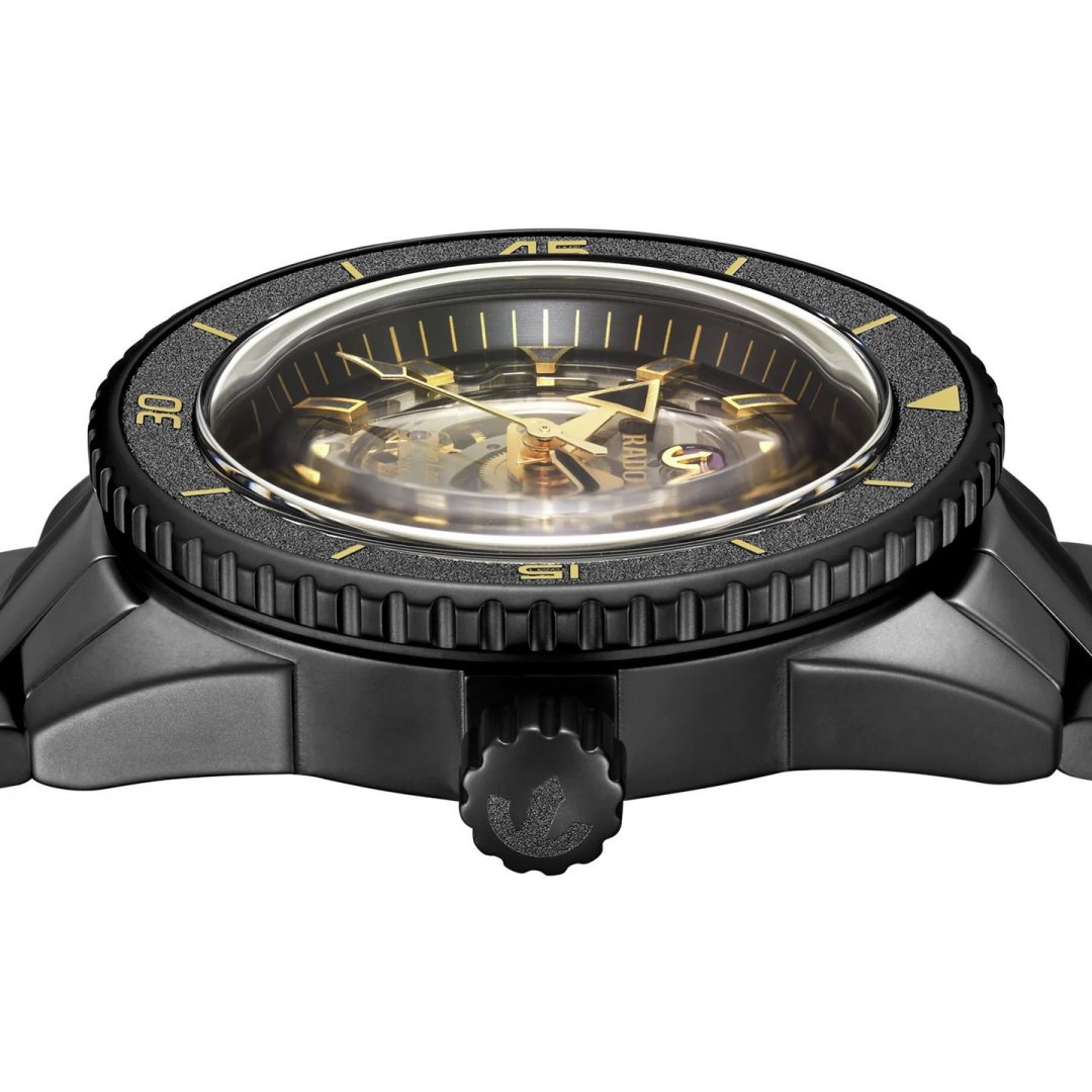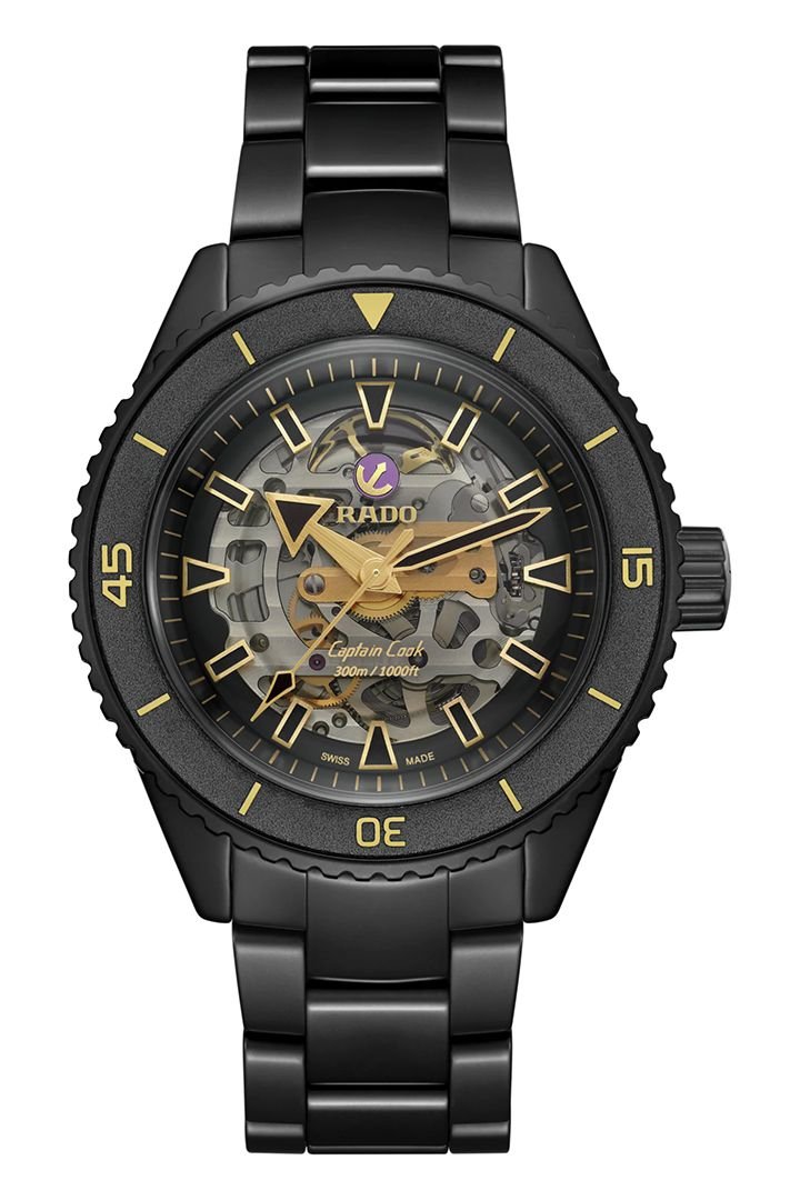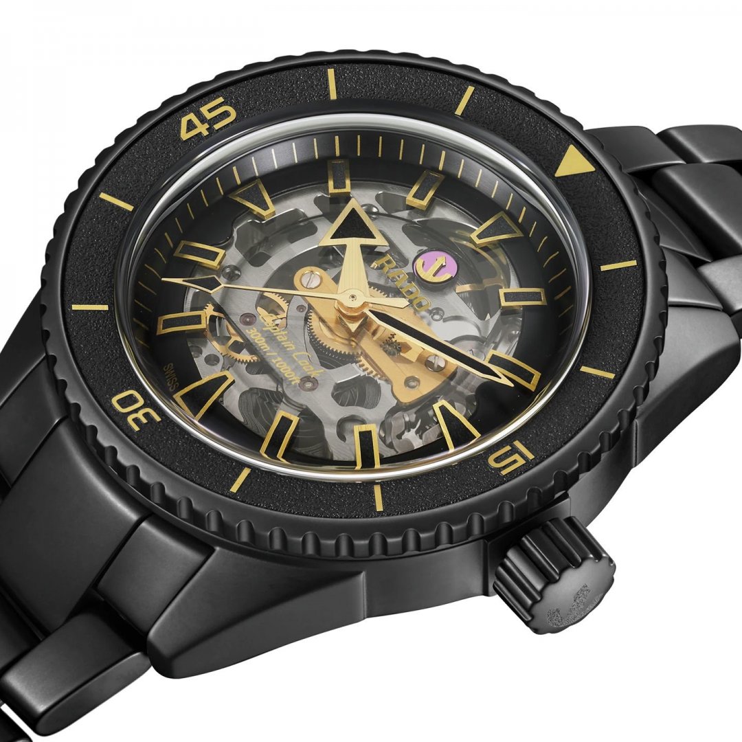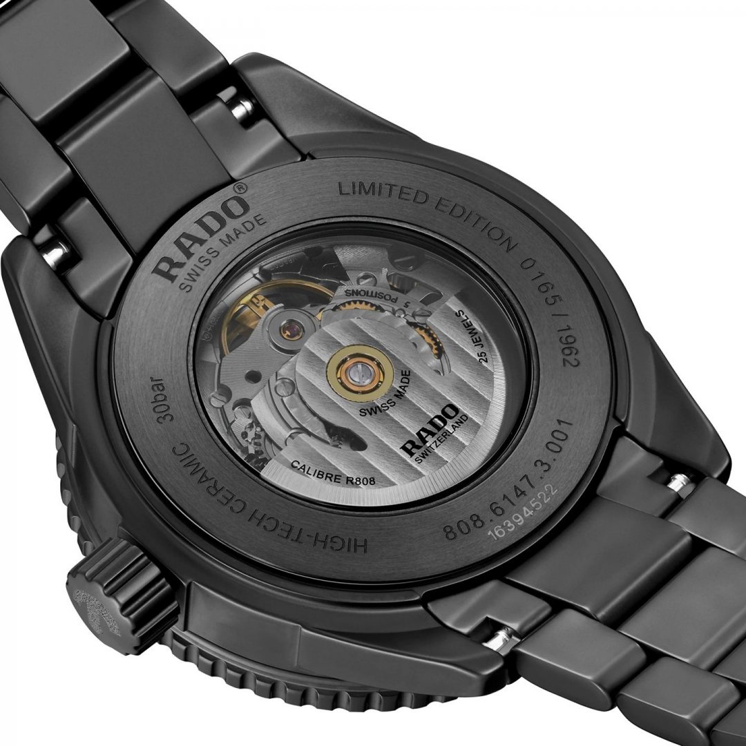 A Captain Cook High-Tech Ceramic Limited Edition nemcsak az első Rado óra a vadonatúj R808 kaliberrel, hanem az első Captain Cook modell is, amely ujjlenyomat-ellenes szerkezetű high-tech kerámiabetétekkel rendelkezik. Ezen túlmenően, most először a teljes lünetta és a korona is high-tech kerámiából készült. A hárommutatós óramű az antimágneses Nivachron™ hajszálrugónak köszönhetően 3-tól 5 pozícióig meghaladja a szabványos pontossági tesztek követelményeit. Ez az ikonikus 43 mm-es óra 300 m-ig vízálló, és 80 óra járástartalékot kínál. A mattfekete high-tech kerámia tok és a füstszínű zafírüveg mellett a dizájn azt a kompromisszummentes karaktert mutatja, amely annyira megfelel a jól ismert, felismerhető Captain Cook hagyományoknak. A dizájnt gyönyörűen kiegészíti a matt fekete színű, high-tech kerámiából készült karperec, kerámia nyomógombokkal ellátott, titánból készült, háromszorosan hajtogatható zárral. Az óra 1962 darabra limitált, folyamatos számozással.