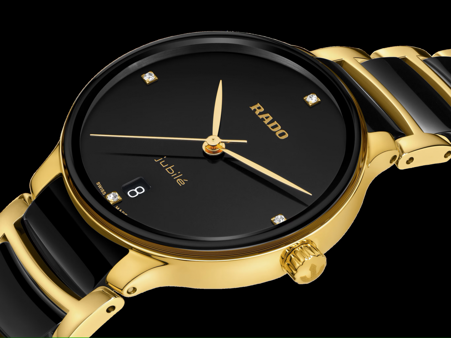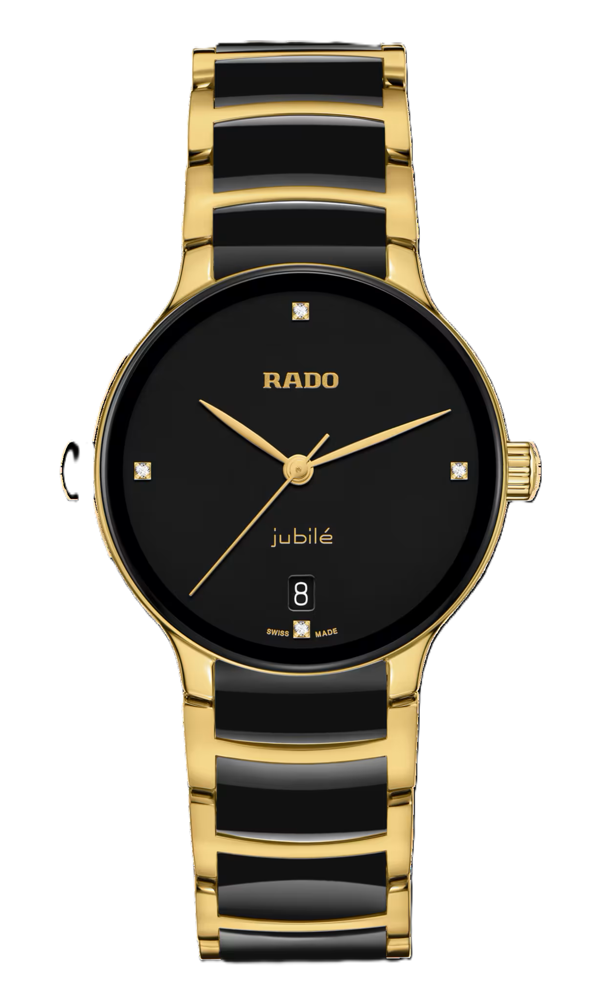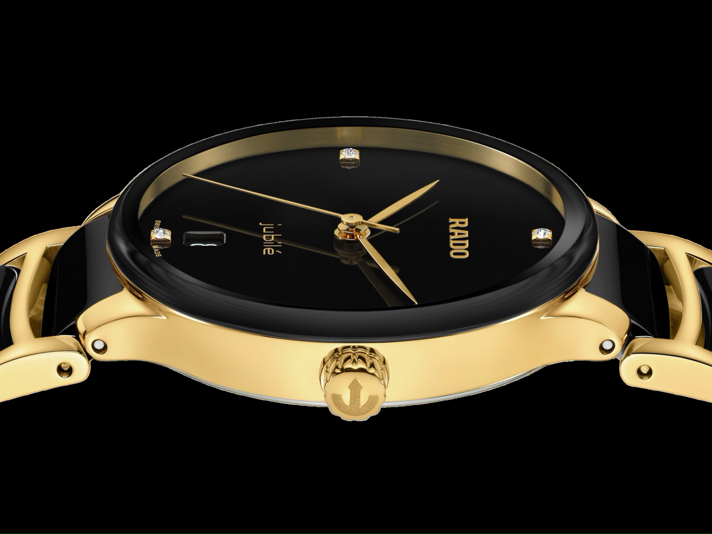 A klasszikus Centrix Quartz Diamonds órát nemcsak technikailag, hanem esztétikailag is átdolgozták. A módosított modell lekerekített zafírkristályt kapott, amely egészen a pereméig ér, és az ívelt tok egybeolvad az ívelt kristályperemmel. Az ikonikus óra általános megjelenését kiigazított tokfülek és egy polírozott sárgaarany színű, PVD-bevonatú rozsdamentes acélból készült, fekete high-tech kerámia középső láncszemekkel ellátott csat teszi teljessé. A fekete lakkozott, 4 gyémánttal díszített számlap, amelyet a nyomtatott „jubilé” logó hangsúlyoz, tökéletesen illeszkedik a sárgaarany színű mutatókhoz. Az R073 kaliberű kvarcmű PreciDrive és HeavyDrive funkcióinak köszönhetően az óra nagyobb pontossággal és ütésállósággal rendelkezik. Az óra 50 m mélységig vízálló.