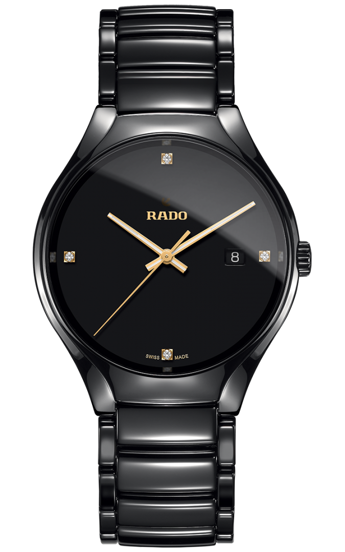 Luxus órák Rado True Diamonds, Quartz, 40 mm. Az óra ezen funkciókkal rendelkezik: adatmutató. Szerkezet típusa: Kvarc óra, vízállóság: 50 m, számlap színe: fekete, szíj anyaga: kerámia.