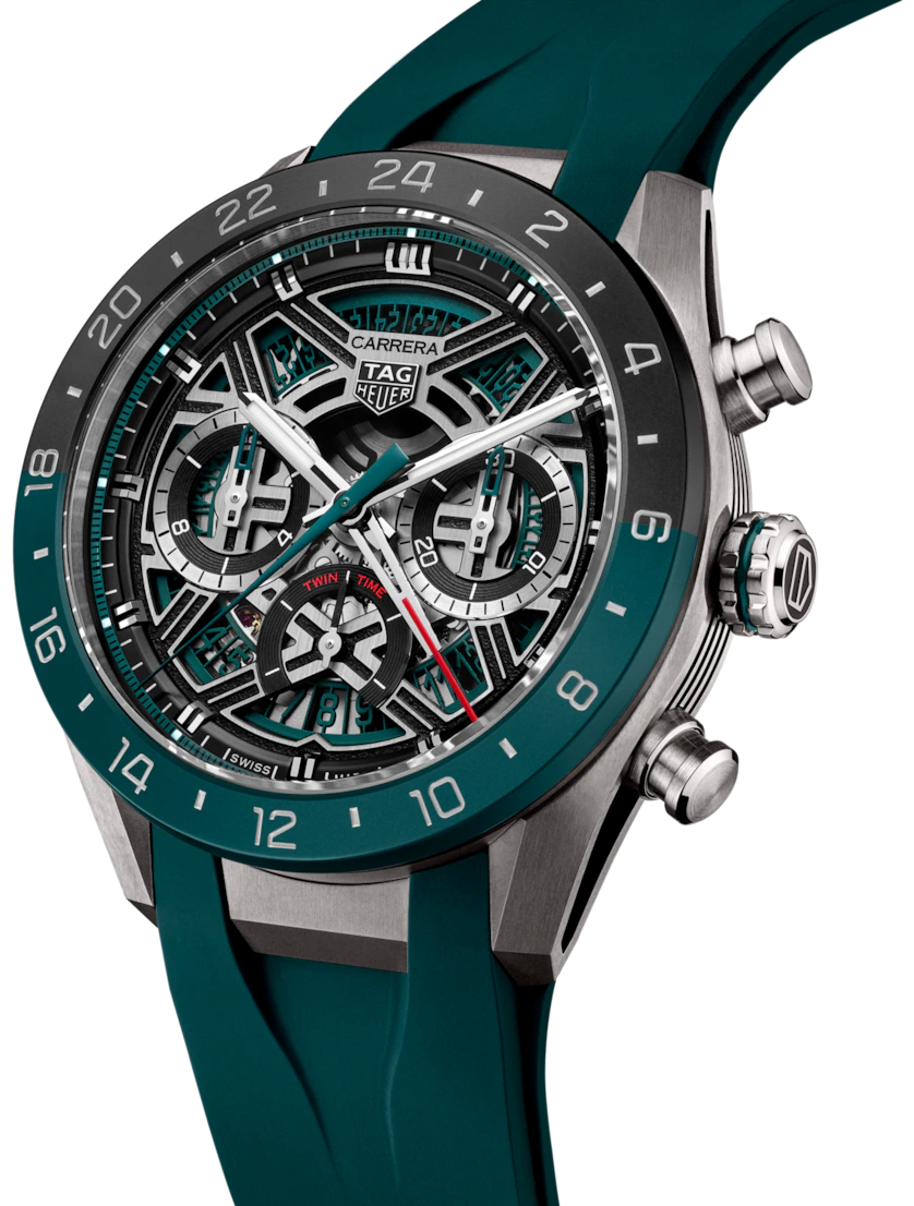 A TAG Heuer Carrera Chronograph Extreme Sport Twin‑Time CBU2084.FT6297 óra a legmodernebb technológiát, a sportos robusztusságot és a motorsport világából ihletett ikonikus dizájnt ötvözi magában. Lenyűgöző türkizkék színe, nyitott csontvázszerű számlapja és titán tokja egy olyan modellt alkotnak, amely azonnal magára vonzza a tekintetet, miközben maximális funkcionalitást kínál.