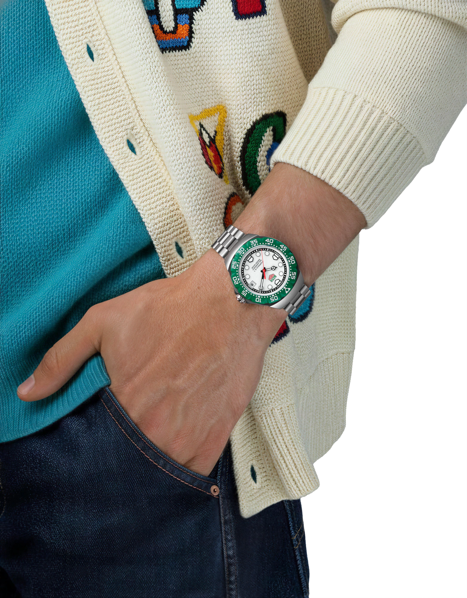 A fehér opálos számlap piros, zöld és fekete díszítéssel utal a versenyidőmérőkre és a TAG Heuer márka DNS-ére. Ez egy olyan óra, amely ugyanolyan dinamikus, mint a Formula 1 világa.