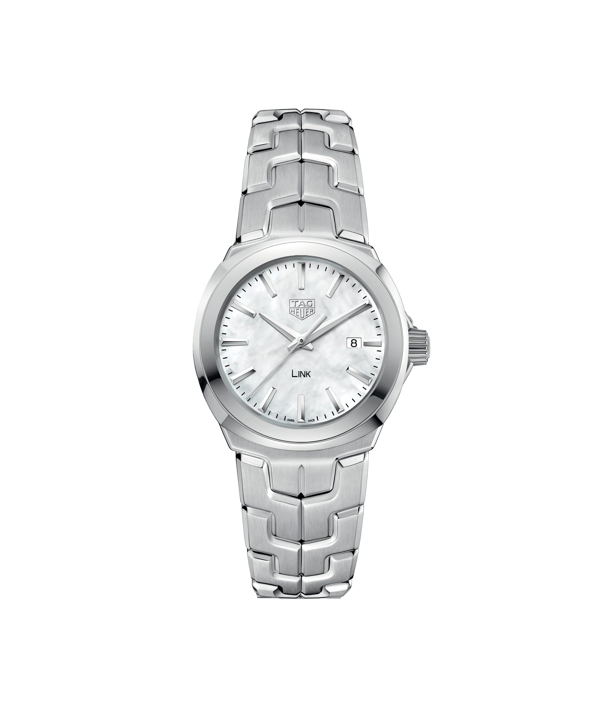 Luxus órák TAG Heuer Link Mother of Pearl, Quartz, 32 mm. Az óra ezen funkciókkal rendelkezik: adatmutató. Számlap színe: gyöngyház, szíj anyaga: acél, vízállóság: 100 m, szerkezet típusa: Kvarc óra.