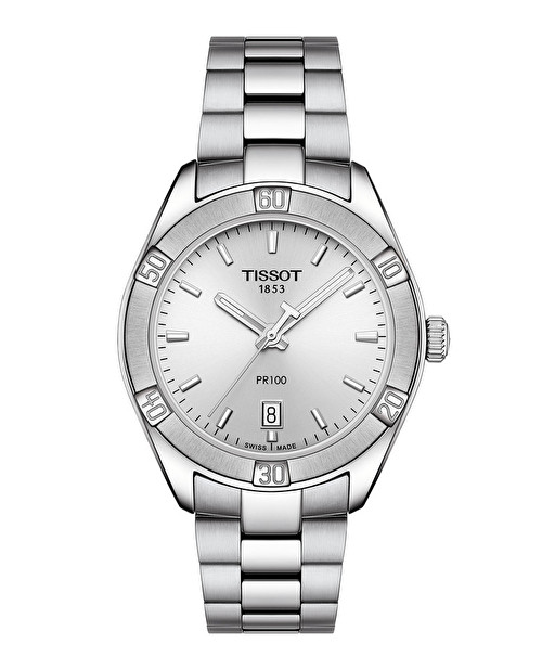 Luxus órák Tissot T-Classic PR 100, Quartz, Water resistance 100M, 36 mm. Az óra ezen funkciókkal rendelkezik: lumineszcencia, adatmutató, E.O.L.. Szerkezet típusa: Kvarc óra, szíj anyaga: acél, vízállóság: 100 m, számlap színe: ezüst.