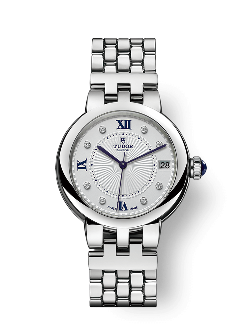 Luxus órák Tudor Clair De Rose 34mm acél tok Acél csat gyémántok. Az óra ezen funkciókkal rendelkezik: naptár. Számlap színe: fehér, szerkezet típusa: mechanikus óra automata felhúzással, szíj anyaga: acél, vízállóság: 100 m.