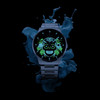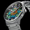 A Flor de Muerto, az ünnep szimbolikájához tartozó virágok között, 3 óránál elhelyezkedő dátumablak, és a hozzá tartozó, az átlátszó számlapon keresztül megtekinthető dátumtárcsa is jól illeszkedik a Commander Gradient kollekciók esztétikájához. Az óra a vidám fesztiválhangulathoz illő trükköt is tartogat a tarsolyában, méghozzá azt, hogy a Catrinas halálfej ábrázolása Super-LumiNova foszforeszkáló bevonattal van ellátva, amely a hagyományos óragyártásban egyértelműen funkcionális célokat szolgáló éjjeli megvilágítás egyik legmerészebb értelmezése. Lekapcsolt fények mellett a számlap egészen más arcát mutatja...